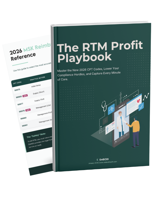 Let’s talk about how EMBODI helps you increase visit consistency, capture RTM revenue with confidence, and give your patients support that actually sticks.